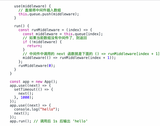 简单分析一下这里的关键点,next 函数如何注入,首先 next 函数调用没有参数,所以上面的 () => runMiddleware(index + 1) 中 () 没有参数,调用 next 函数时需要调用进行下一个中间件的执行,所以需要自调用。