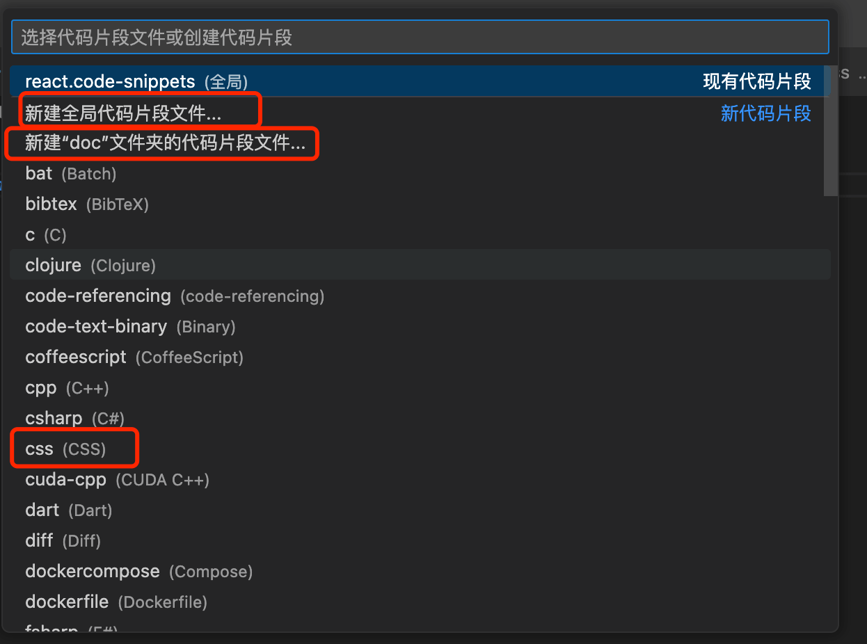 - 选择代码片段作用类型,这里有全局/项目/语言 3 种,这里建议选择全局,便于各个项目使用,语言层面可以使用 snippets 的语法来限制(后面会讲到)