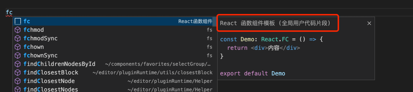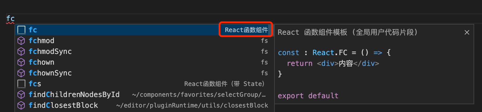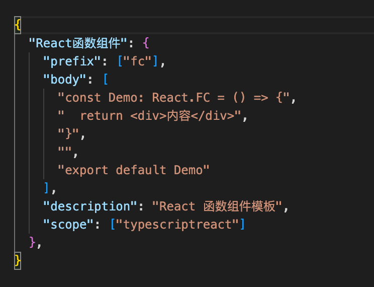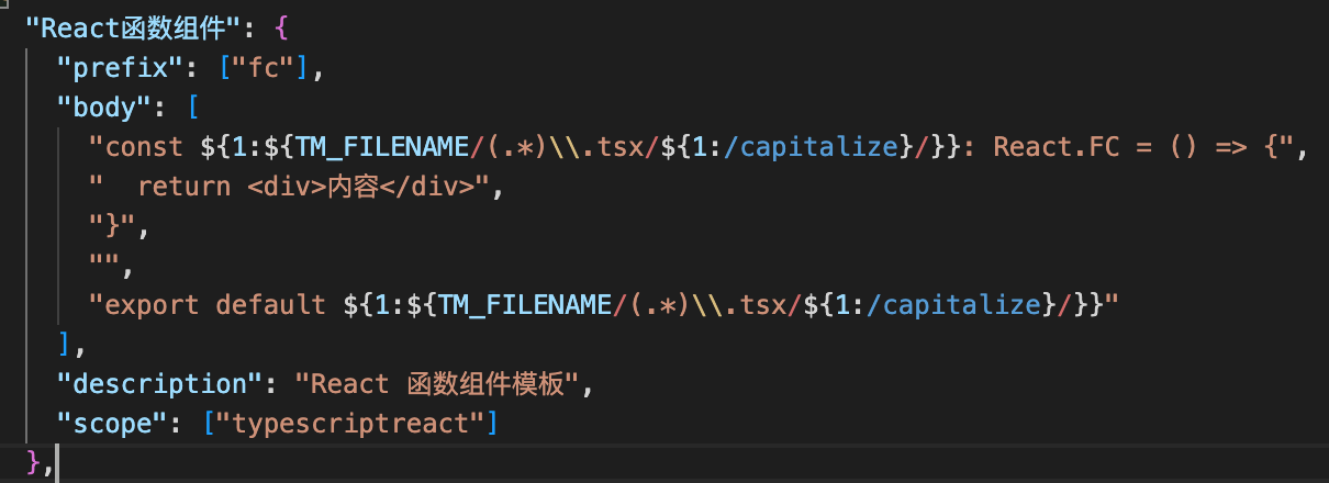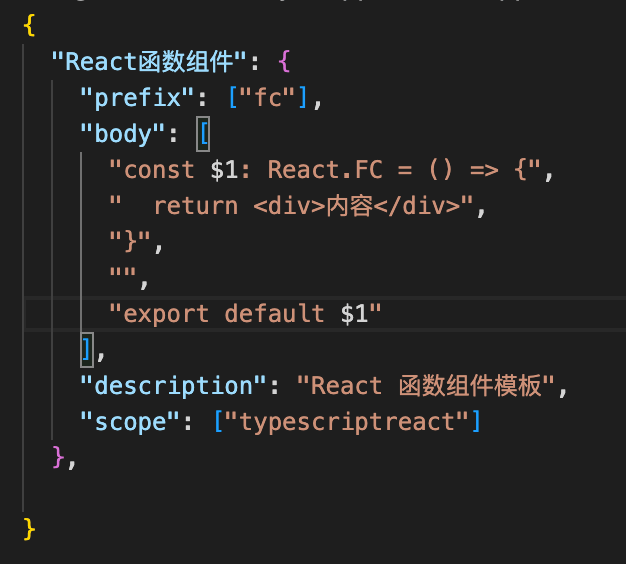- 选择后进入 Snippets 的配置文件,这里以一个常见的函数组件模版为例
