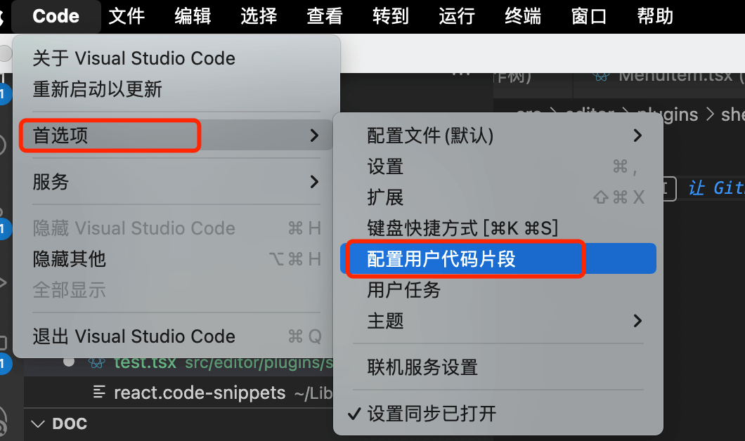 - 进入首选项,选择配置用户代码片段(Code => 首选项 => 配置用户代码片段)